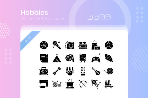 This icons contains 25 Hobbies Icon Pack Flat, Glyph and Outline Icons in Line style that can be used for several projects. Designed with simple clean and fresh look. Vector files easy editable, so you can change its properties and get a whole new look. This mini set Icon is ideal for helping you tell a story about your mobile or web products in a fun and compelling way.