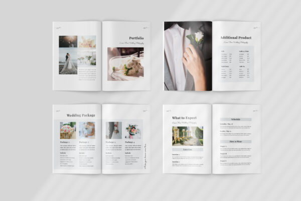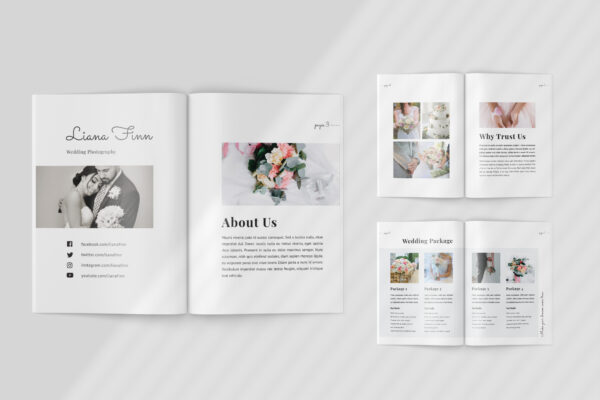 Multipurpose template and price list for photographers ! Clean, modern and fully customisable. Ideal for wedding photography packages, photography services, price lists and advertising. This template have 20 print page template and optional size A4 Letter size. Perfect for any purposes so you have a variety to choose from to find the perfect fit for your project.