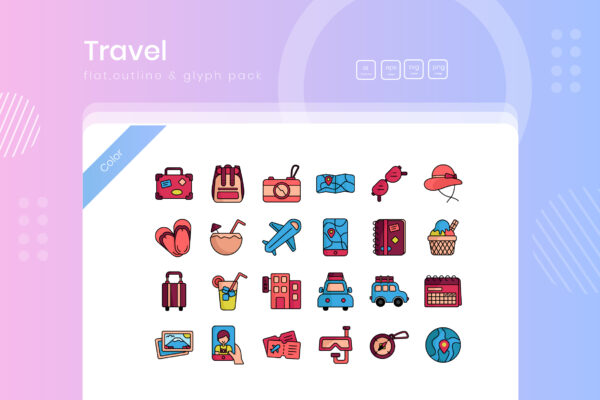 This icons contains 25 Travel Flat, Glyph and Outline Icons in Line style that can be used for several projects. Designed with simple clean and fresh look. Vector files easy editable, so you can change its properties and get a whole new look. This mini set Icon is ideal for helping you tell a story about your mobile or web products in a fun and compelling way.